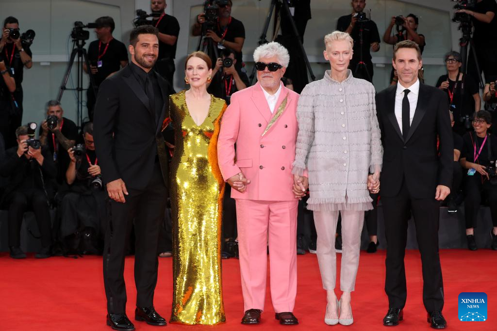 VENECIA, 3 septiembre, 2024 (Xinhua) -- (De izq. a der.) Imagen del 2 de septiembre de 2024 de Alvise Rigo, Julianne Moore, Pedro Almodóvar, Tilda Swinton y Alessandro Nivola posando para una fotografía en la alfombra roja previo al estreno de la película "The Room Next Door" durante el 81 Festival Internacional de Cine de Venecia, en Venecia, Italia. (Xinhua/Li Jing)