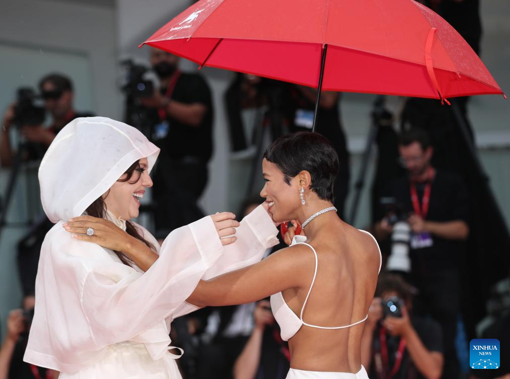 VENECIA, 3 septiembre, 2024 (Xinhua) -- Imagen del 2 de septiembre de 2024 de la actriz canadiense, Taylor Russell (d), y la actriz brasileña, Barbara Paz, vistas en la alfombra roja previo al estreno de la película "The Room Next Door" durante el 81 Festival Internacional de Cine de Venecia, en Venecia, Italia. (Xinhua/Li Jing)