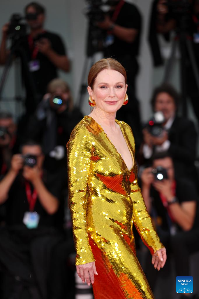 VENECIA, 3 septiembre, 2024 (Xinhua) -- Imagen del 2 de septiembre de 2024 de la actriz, Julianne Moore, posando para una fotografía en la alfombra roja previo al estreno de la película "The Room Next Door" durante el 81 Festival Internacional de Cine de Venecia, en Venecia, Italia. (Xinhua/Li Jing)