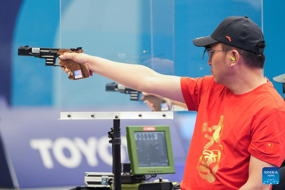 CHATEAUROUX, 3 septiembre, 2024 (Xinhua) -- Imagen del 2 de septiembre de 2024 de Yang Chao de China compitiendo durante la final P3 de pistola mixta 25m SH1 de para tiro olímpico en los Juegos Paralímpicos de París 2024, en Chateauroux, Francia. (Xinhua/Peng Ziyang)
