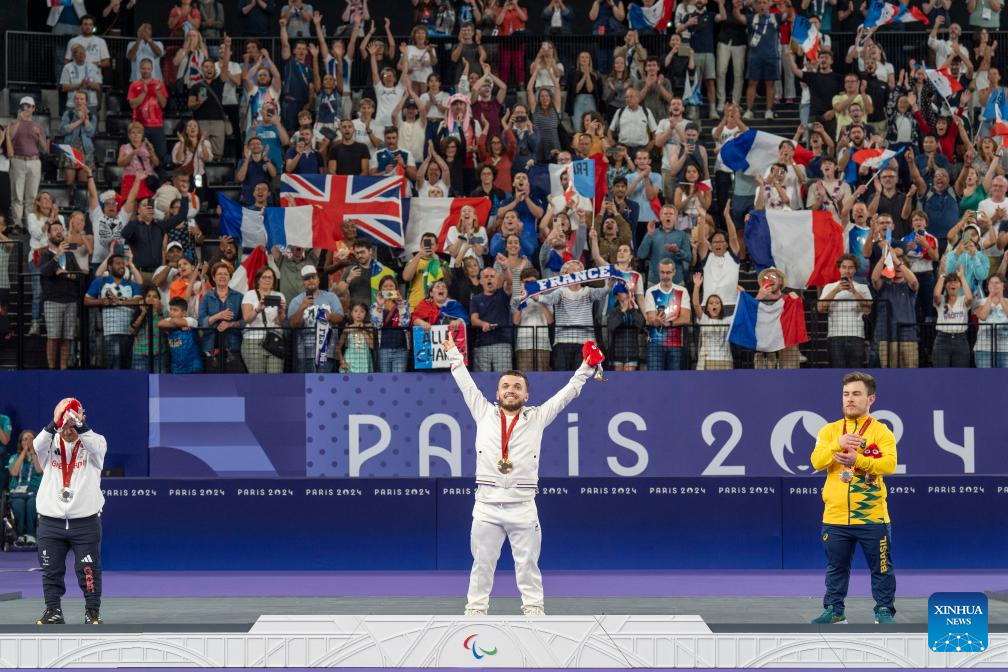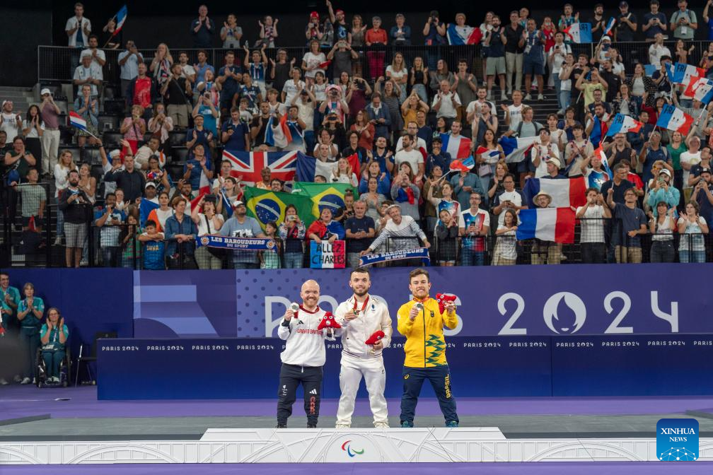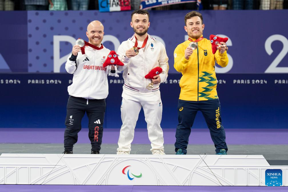 PARIS, 3 septiembre, 2024 (Xinhua) -- Imagen del 2 de septiembre de 2024 del medallista de oro Charles Noakes (c) de Francia, el medallista de plata Krysten Coombs (i) de Gran Bretaña y el medallista de bronce Vitor Tavares de Brasil reaccionando durante la ceremonia de premiación después del partido por la medalla de oro de individual masculino SH6 de para bádminton en los Juegos Paralímpicos de París 2024, en París, Francia. (Xinhua/Cai Yang)