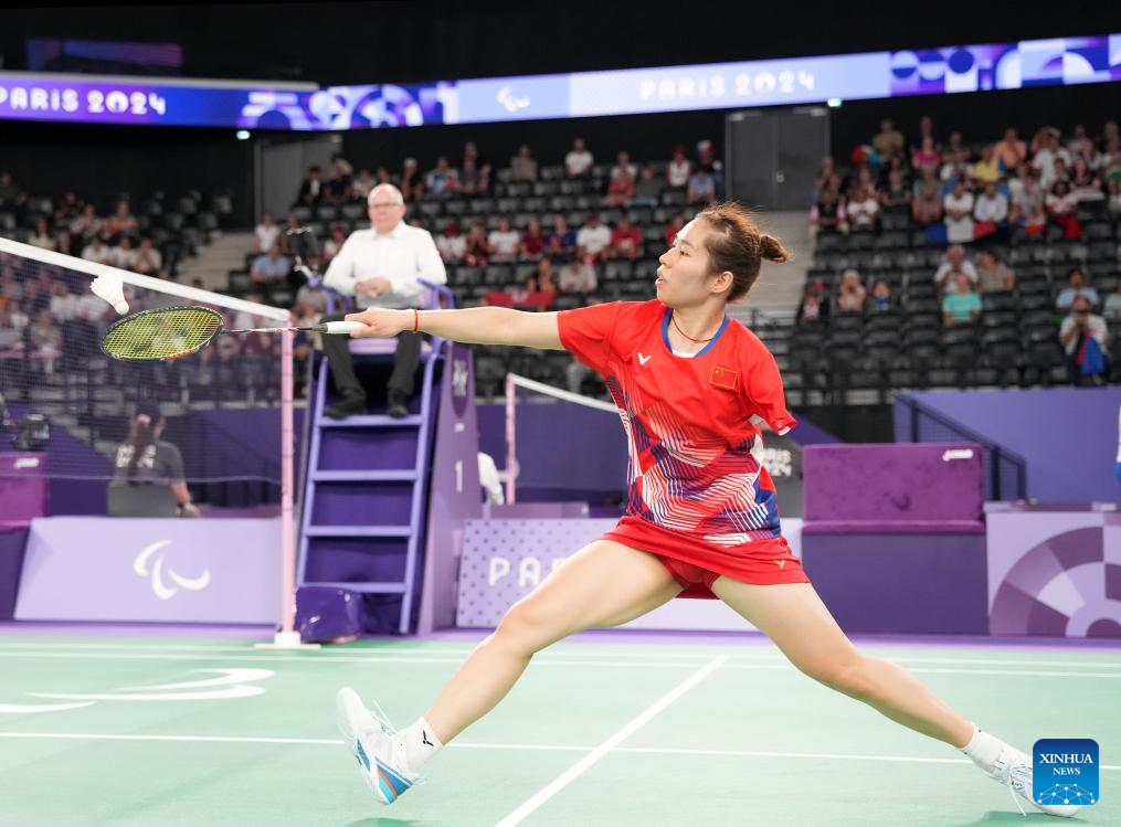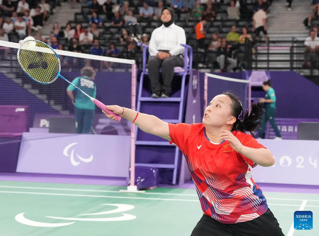 PARIS, 3 septiembre, 2024 (Xinhua) -- Imagen del 2 de septiembre de 2024 de Yang Qiuxia de China devolviendo el volante durante el partido por la medalla de oro de individuales femeninos SU5 de para bádminton en los Juegos Paralímpicos de París 2024, en París, Francia. (Xinhua/Cai Yang)
