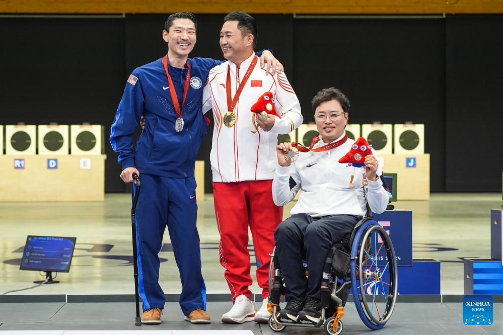 CHATEAUROUX, 3 septiembre, 2024 (Xinhua) -- Imagen del 2 de septiembre de 2024 del medallista de oro Yang Chao (c) de China, el medallista de plata Yan Xiao Gong (i) de Estados Unidos y el medallista de bronce Kim Jungnam de República de Corea reaccionando durante la ceremonia de premiación después de la final de P3 de pistola mixta 25m SH1 de para tiro olímpico en los Juegos Paralímpicos de París 2024, en Chateauroux, Francia. (Xinhua/Peng Ziyang)