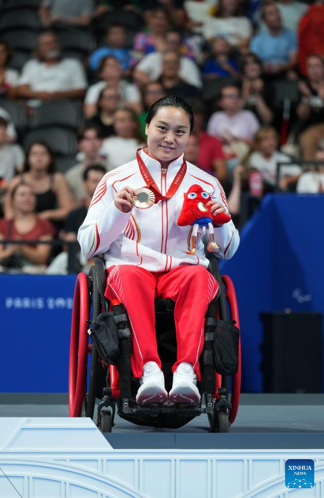 PARIS, 3 septiembre, 2024 (Xinhua) -- Imagen del 2 de septiembre de 2024 de la medallista de bronce Cheng Jiao de China reaccionando durante la ceremonia de premiación al término de la final de 100m braza de SB4 femeninos de para natación en los Juegos Paralímpicos de París 2024, en París, Francia. (Xinhua/Zhang Haofu)