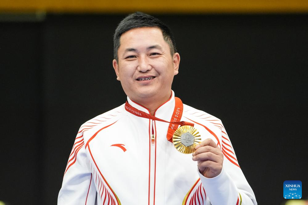 CHATEAUROUX, 3 septiembre, 2024 (Xinhua) -- Imagen del 2 de septiembre de 2024 del medallista de oro Yang Chao de China reaccionando durante la ceremonia de premiación al término de la final de P3 de pistola mixta 25m SH1 de para tiro olímpico en los Juegos Paralímpicos de París 2024, en Chateauroux, Francia. (Xinhua/Peng Ziyang)