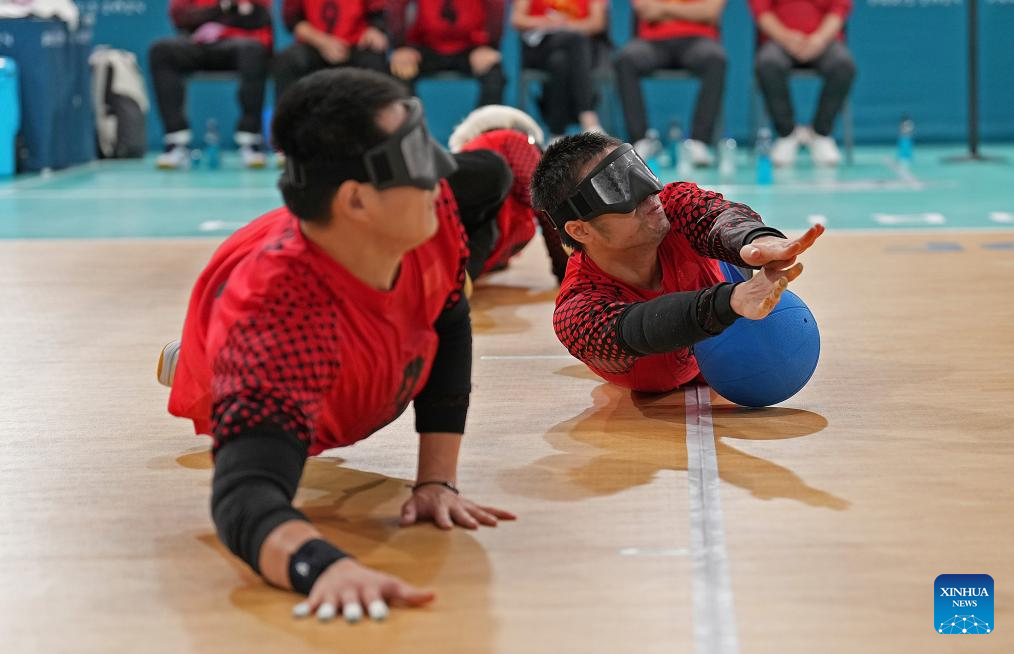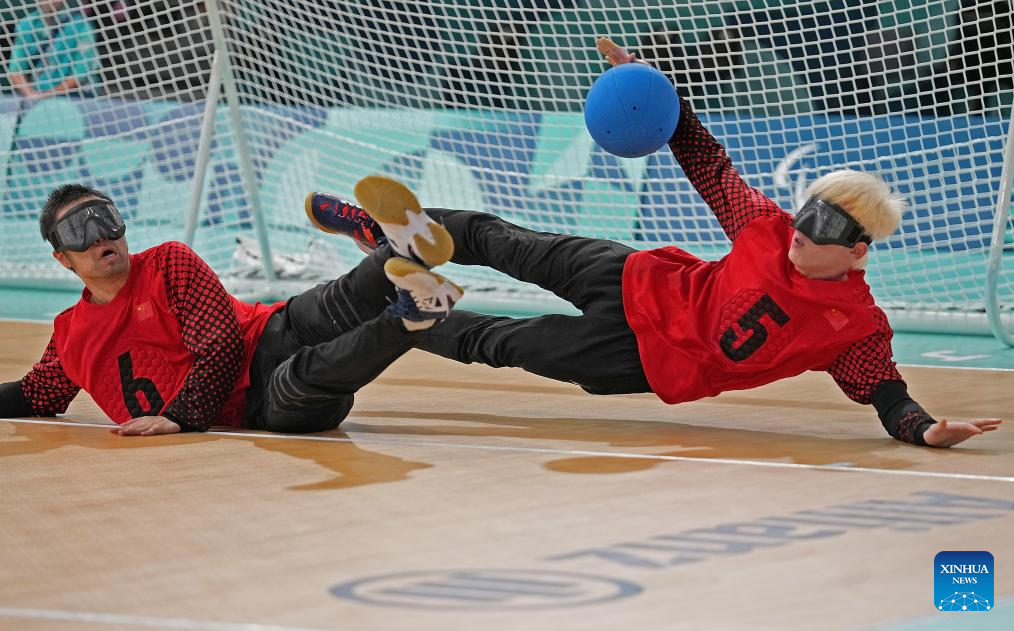 PARIS, 3 septiembre, 2024 (Xinhua) -- Imagen del 2 de septiembre de 2024 de Hu Mingyao (d) y Yu Qinquan de China compitiendo ante el equipo de Francia durante el partido de cuartos de final de goalball masculino entre China y Francia en los Juegos Paralímpicos de París 2024, en París, Francia. (Xinhua/Hou Zhaokang)