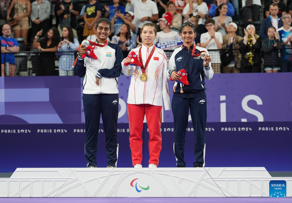 PARIS, 3 septiembre, 2024 (Xinhua) -- Imagen del 2 de septiembre de 2024 de la medallista de oro Yang Qiuxia (c) de China, la medallista de plata Thulasimathi Murugesan (i) de India y la medallista de bronce Manisha Ramadass de India reaccionan durante la ceremonia de premiación al término del partido por la medalla de oro de individuales femeninos SU5 de para bádminton en los Juegos Paralímpicos de París 2024, en París, Francia. (Xinhua/Cai Yang)