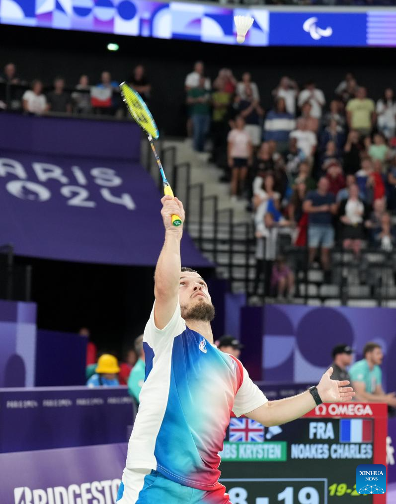 PARIS, 3 septiembre, 2024 (Xinhua) -- Imagen del 2 de septiembre de 2024 de Charles Noakes de Francia devolviendo el volante durante el partido por la medalla de oro de individual masculino SH6 de para bádminton ante Krysten Coombs de Gran Bretaña en los Juegos Paralímpicos de París 2024, en París, Francia. (Xinhua/He Canling)