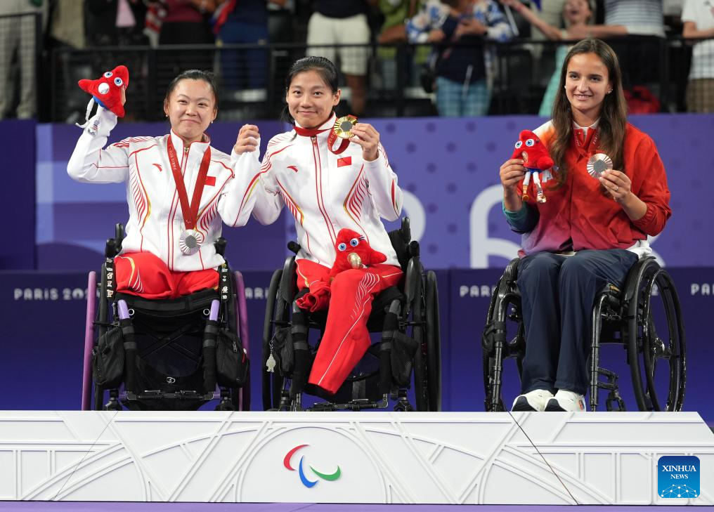 PARIS, 3 septiembre, 2024 (Xinhua) -- Imagen del 2 de septiembre de 2024 de la medallista de oro Liu Yutong (c) de China, la medallista de plata Li Hongyan (i), de China, y la medallista de bronce Ilaria Renggli, de Suiza, reaccionando durante la ceremonia de premiación al término del partido por la medalla de oro de WH2 individual femenino de para bádminton en los Juegos Paralímpicos de París 2024, en París, Francia. (Xinhua/Cai Yang)
