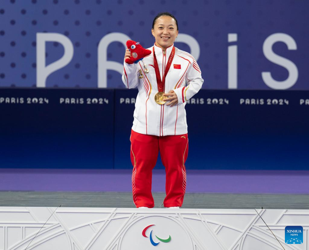 PARIS, 3 septiembre, 2024 (Xinhua) -- Imagen del 2 de septiembre de 2024 de la medallista de oro Li Fengmei de China festejando durante la ceremonia de premiación al término del partido por la medalla de oro de individuales femeninos SH6 de para bádminton en los Juegos Paralímpicos de París 2024, en París, Francia. (Xinhua/Cai Yang)