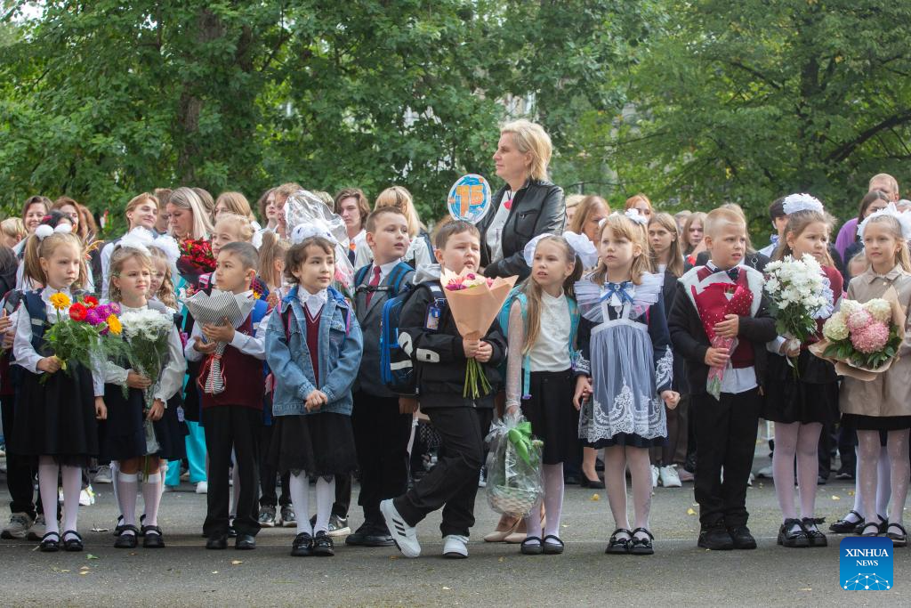 SAN PETERSBURGO, 3 septiembre, 2024 (Xinhua) -- Imagen del 2 de septiembre de 2024 de niños asistiendo a una ceremonia que marca el nuevo semestre en una escuela, en San Petersburgo, Rusia. Las escuelas secundarias y primarias de Rusia comenzaron sus nuevos semestres el lunes. (Xinhua/Irina Motina)