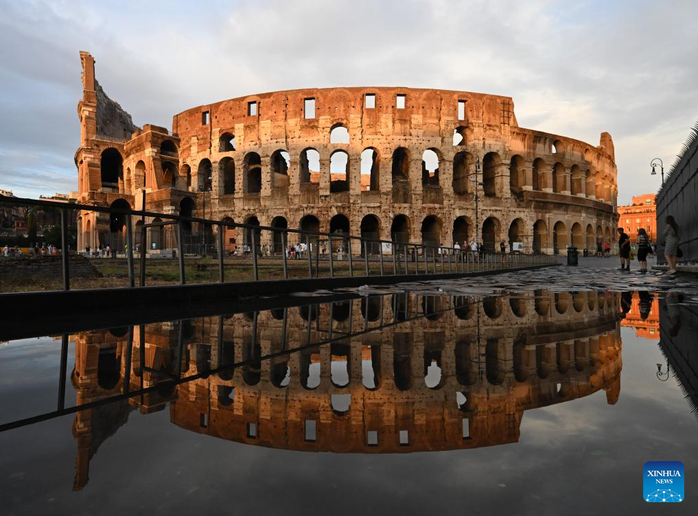 ROMA, 3 septiembre, 2024 (Xinhua) -- El Coliseo es reflejado en un charco después de una tormenta, en Roma, Italia, el 3 de septiembre de 2024. (Xinhua/Alberto Lingria)