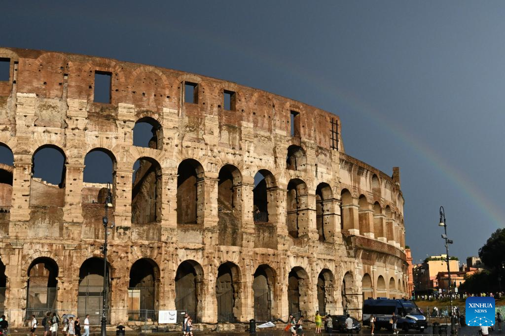 ROMA, 3 septiembre, 2024 (Xinhua) -- Un arcoíris aparece sobre el Coliseo después de una tormenta, en Roma, Italia, el 3 de septiembre de 2024. (Xinhua/Alberto Lingria)