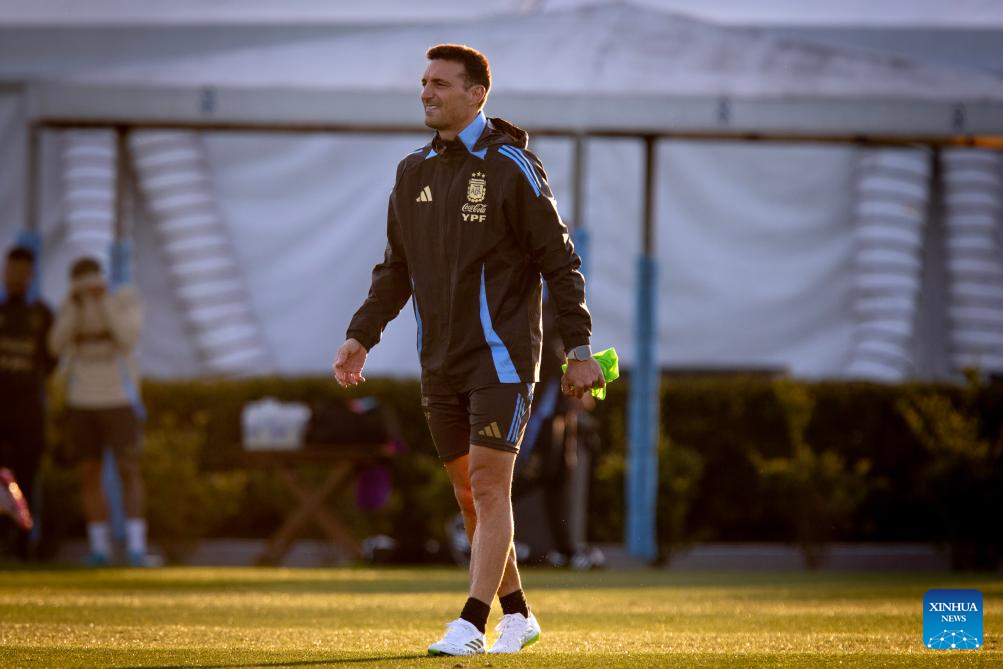 EZEIZA, 4 septiembre, 2024 (Xinhua) -- Imagen del 3 de septiembre de 2024 del director técnico de la selección argentina de fútbol, Lionel Scaloni, reaccionando durante una sesión de entrenamiento en el predio de la Asociación Argentina de Fútbol, en la ciudad de Ezeiza, Argentina. El seleccionado argentino de fútbol se entrenó el martes con vistas al partido del jueves próximo ante Chile, por las Eliminatorias Sudamericanas para el Mundial de Estados Unidos, México y Canadá 2026. (Xinhua/Martín Zabala)