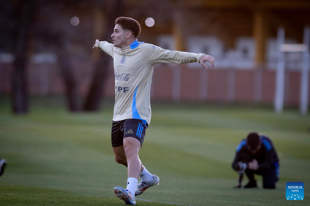 EZEIZA, 4 septiembre, 2024 (Xinhua) -- Imagen del 3 de septiembre de 2024 del jugador de la selección argentina de fútbol, Julián Alvarez, reaccionando durante una sesión de entrenamiento en el predio de la Asociación Argentina de Fútbol, en la ciudad de Ezeiza, Argentina. El seleccionado argentino de fútbol se entrenó el martes con vistas al partido del jueves próximo ante Chile, por las Eliminatorias Sudamericanas para el Mundial de Estados Unidos, México y Canadá 2026. (Xinhua/Martín Zabala)