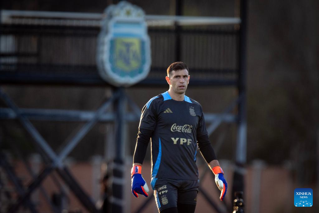 EZEIZA, 4 septiembre, 2024 (Xinhua) -- Imagen del 3 de septiembre de 2024 del guardameta de la selección argentina de fútbol, Emiliano Martínez, reaccionando durante una sesión de entrenamiento en el predio de la Asociación Argentina de Fútbol, en la ciudad de Ezeiza, Argentina. El seleccionado argentino de fútbol se entrenó el martes con vistas al partido del jueves próximo ante Chile, por las Eliminatorias Sudamericanas para el Mundial de Estados Unidos, México y Canadá 2026. (Xinhua/Martín Zabala)