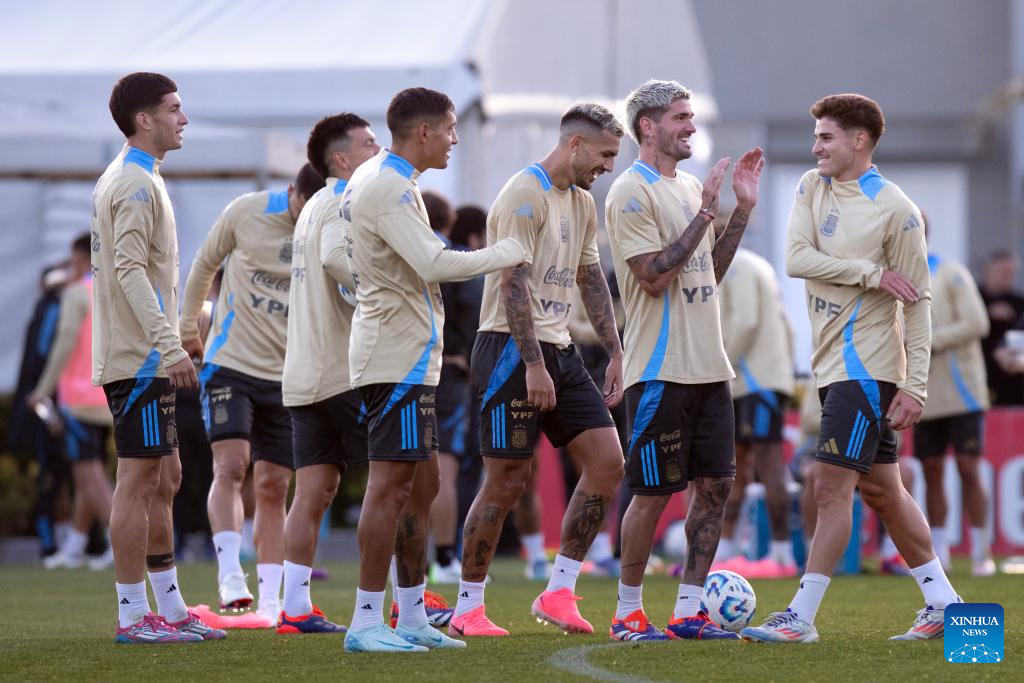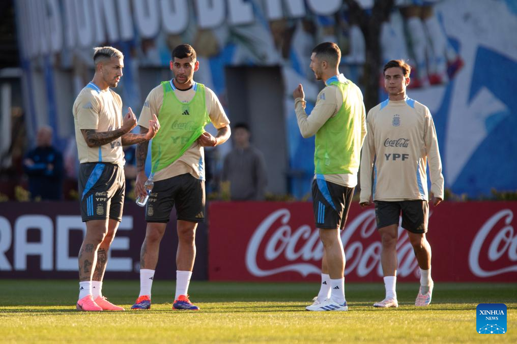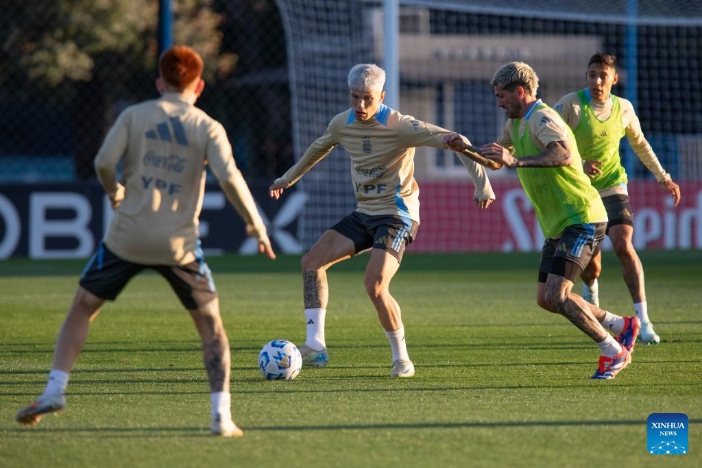 EZEIZA, 4 septiembre, 2024 (Xinhua) -- Imagen del 3 de septiembre de 2024 de jugadores de la selección argentina de fútbol reaccionando durante una sesión de entrenamiento en el predio de la Asociación Argentina de Fútbol, en la ciudad de Ezeiza, Argentina. El seleccionado argentino de fútbol se entrenó el martes con vistas al partido del jueves próximo ante Chile, por las Eliminatorias Sudamericanas para el Mundial de Estados Unidos, México y Canadá 2026. (Xinhua/Martín Zabala)