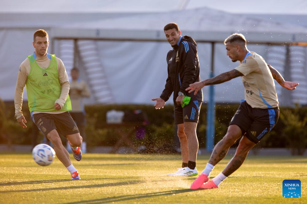 EZEIZA, 4 septiembre, 2024 (Xinhua) -- Imagen del 3 de septiembre de 2024 del director técnico de la selección argentina de fútbol, Lionel Scaloni (c), y los jugadores Giovani Lo Celso (i), y Leandro Paredes (d), reaccionando durante una sesión de entrenamiento en el predio de la Asociación Argentina de Fútbol, en la ciudad de Ezeiza, Argentina. El seleccionado argentino de fútbol se entrenó el martes con vistas al partido del jueves próximo ante Chile, por las Eliminatorias Sudamericanas para el Mundial de Estados Unidos, México y Canadá 2026. (Xinhua/Martín Zabala)