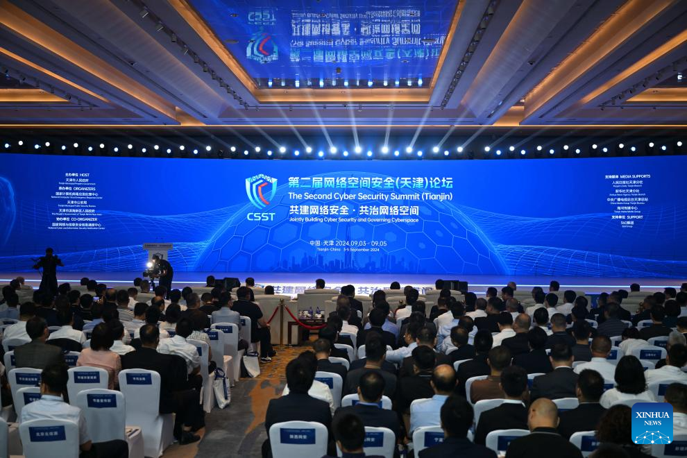 (240904) -- TIANJIN, 4 septiembre, 2024 (Xinhua) -- Imagen del 4 de septiembre de 2024 de la segunda Cumbre de Ciberseguridad (de Tianjin) (CSST, por sus siglas en inglés), en la municipalidad de Tianjin, en el norte de China. La segunda CSST se lleva a cabo aquí bajo el tema "Construcción Conjunta de la Ciberseguridad y Gobernanza del Ciberespacio". (Xinhua/Sun Fanyue) (jg) (ra) (da)