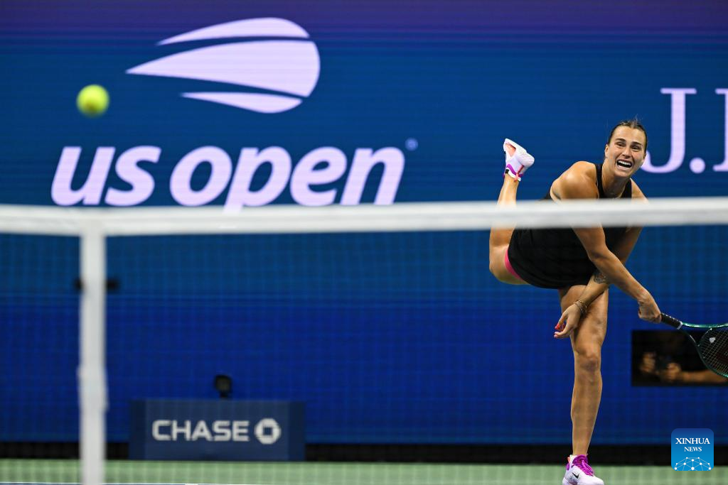 NUEVA YORK, 4 septiembre, 2024 (Xinhua) -- Imagen del 3 de septiembre de 2024 de Aryna Sabalenka, de Bielorrusia, sirviendo la pelota a Zheng Qinwen, de China, durante el partido de cuartos de final de individuales femeninos en el campeonato de tenis US Open 2024, en Nueva York, Estados Unidos. (Xinhua/Li Rui)