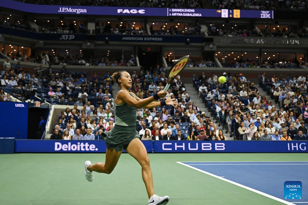NUEVA YORK, 4 septiembre, 2024 (Xinhua) -- Imagen del 3 de septiembre de 2024 de Zheng Qinwen, de China, devolviendo la pelota a Aryna Sabalenka, de Bielorrusia, durante el partido de cuartos de final de individuales femeninos en el campeonato de tenis US Open 2024, en Nueva York, Estados Unidos. (Xinhua/Li Rui)