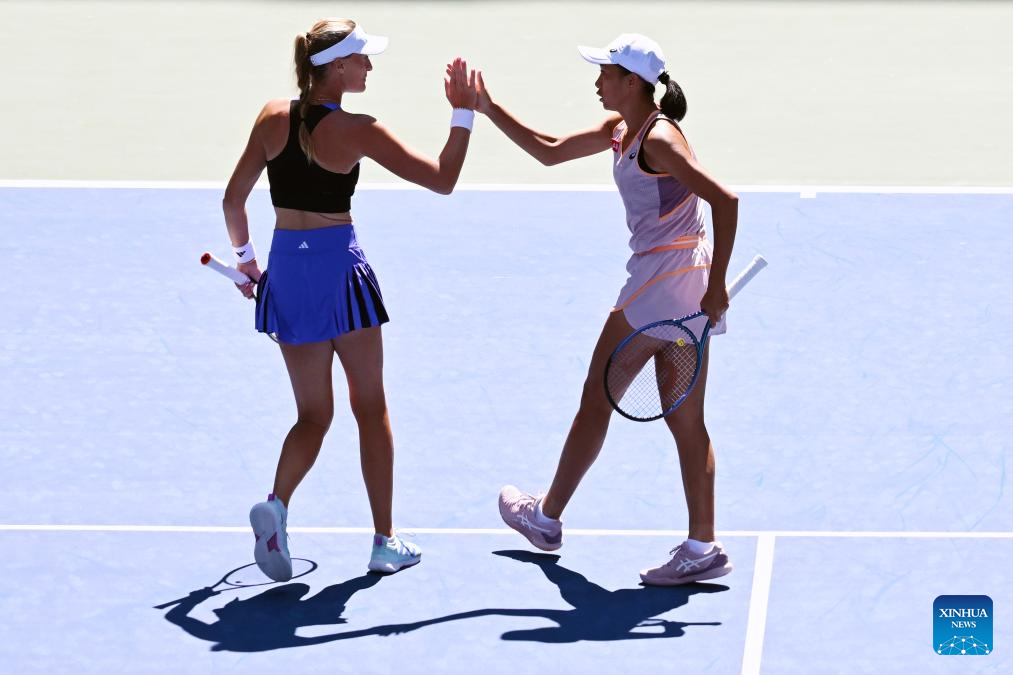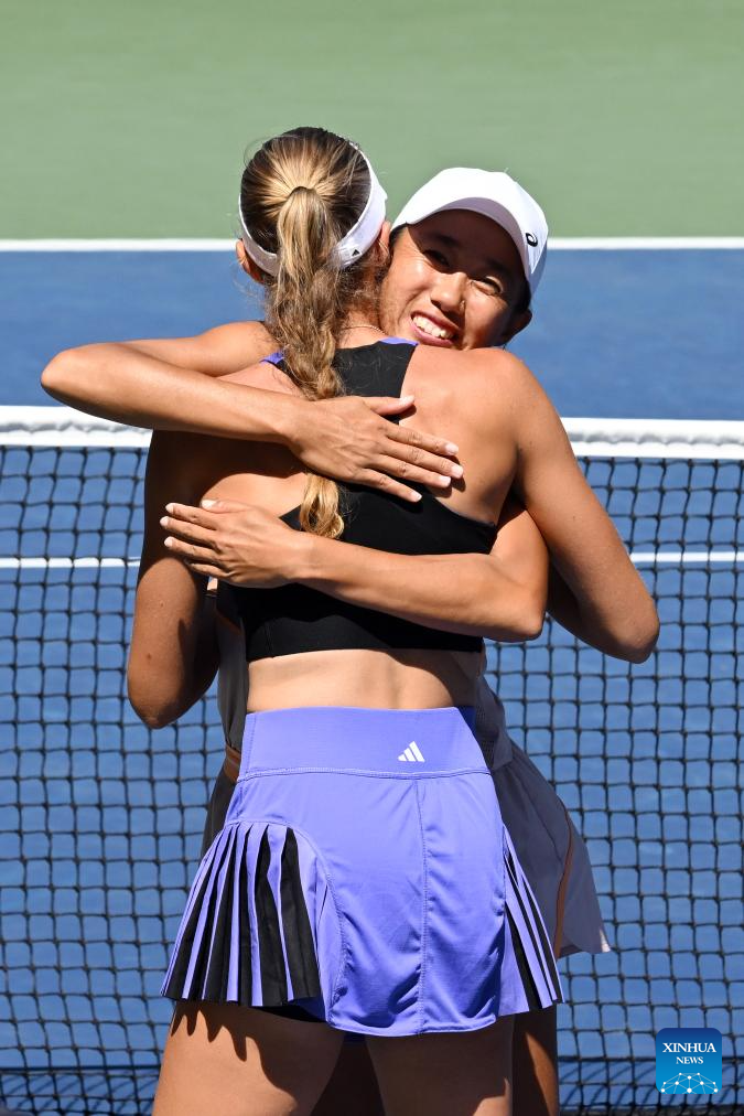 NUEVA YORK, 4 septiembre, 2024 (Xinhua) -- Imagen del 3 de septiembre de 2024 de Zhang Shuai (d) y Kristina Mladenovic festejando al término del partido de cuartos de final de dobles femeninos entre Zhang Shuai de China/Kristina Mladenovic de Francia y Ellen Perez de Australia/Nicole Melichar-Martinez de Estados Unidos en el campeonato de tenis US Open 2024, en Nueva York, Estados Unidos. (Xinhua/Li Rui)