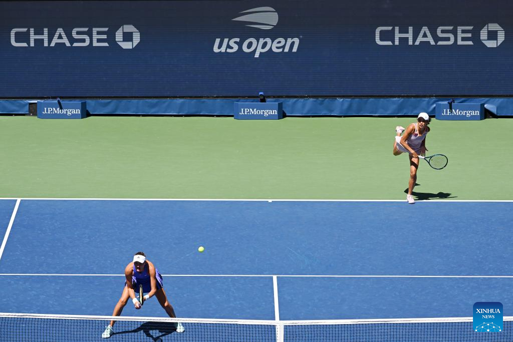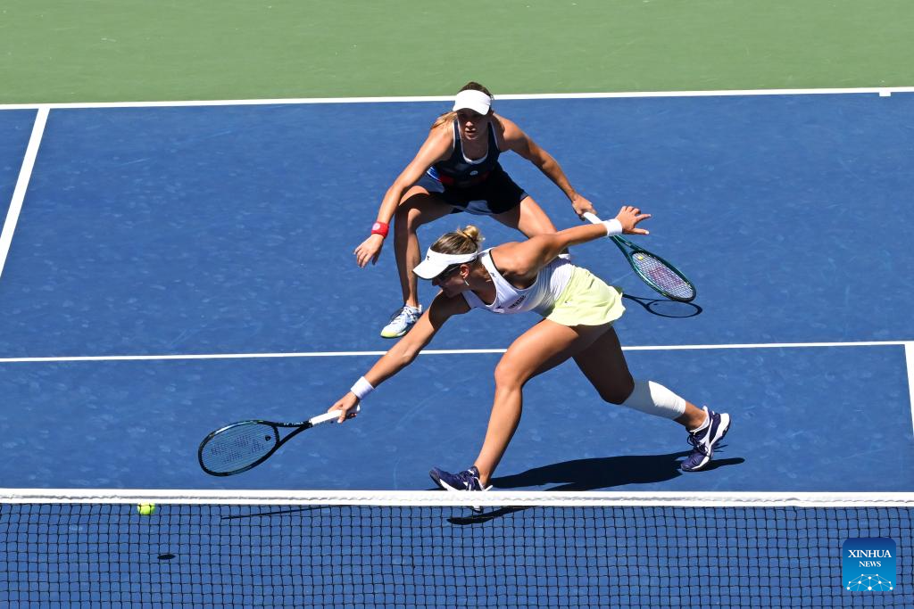 NUEVA YORK, 4 septiembre, 2024 (Xinhua) -- Imagen del 3 de septiembre de 2024 de Ellen Perez (arriba) y Nicole Melichar-Martinez compitiendo durante el partido de cuartos de final de dobles femeninos entre Zhang Shuai de China/Kristina Mladenovic de Francia y Ellen Perez de Australia/Nicole Melichar-Martinez de Estados Unidos en el campeonato de tenis US Open 2024, en Nueva York, Estados Unidos. (Xinhua/Li Rui)