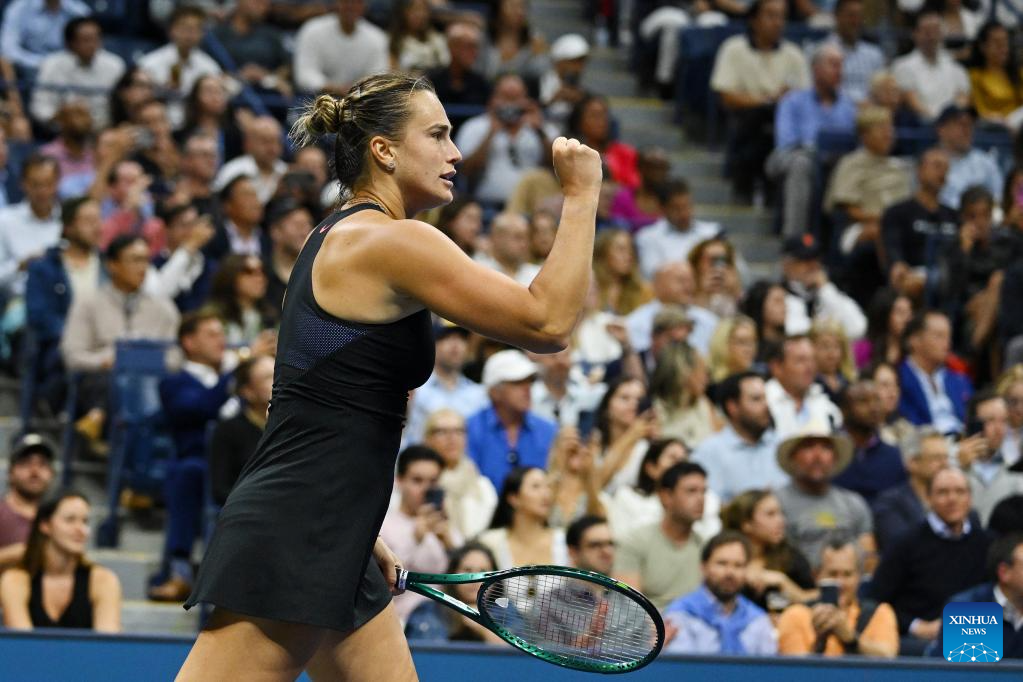 NUEVA YORK, 4 septiembre, 2024 (Xinhua) -- Imagen del 3 de septiembre de 2024 de Aryna Sabalenka, de Bielorrusia, festejando al término del partido de cuartos de final de individuales femeninos en el campeonato de tenis US Open 2024 ante Zheng Qinwen, de China, en Nueva York, Estados Unidos. (Xinhua/Li Rui)