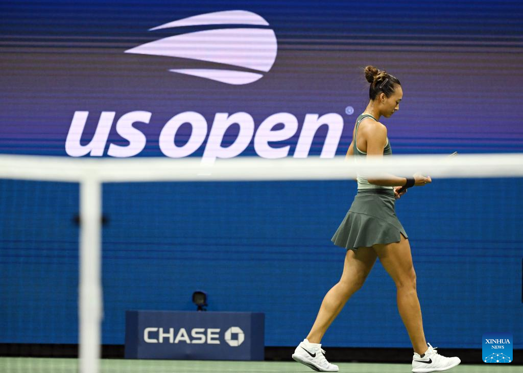 NUEVA YORK, 4 septiembre, 2024 (Xinhua) -- Imagen del 3 de septiembre de 2024 de Zheng Qinwen, de China, reaccionando durante el partido de cuartos de final de individuales femeninos en el campeonato de tenis US Open 2024 ante Aryna Sabalenka, de Bielorrusia, en Nueva York, Estados Unidos. (Xinhua/Li Rui)