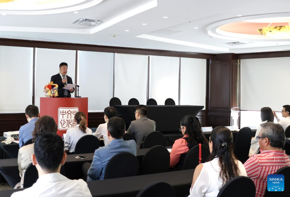 Imagen del 3 de septiembre de 2024 del director del Centro Cultural de China en México, Shi Yuewen (atrás), hablando durante el seminario "¡Hola! China", en la Ciudad de México, capital de México. Representantes de la industria turística mexicana, funcionarios, medios de comunicación chinos y extranjeros, así como figuras del campo de internet, celebraron el martes con gran éxito el seminario "¡Hola! China", en el que se presentaron las últimas políticas de facilitación del turismo de China al público mexicano, así como a distintos operadores turísticos. (Xinhua/Francisco Cañedo)