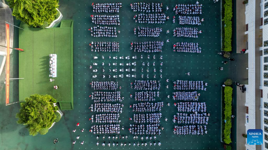 KUNMING, 5 septiembre, 2024 (Xinhua) -- Vista aérea tomada con un dron del 2 de septiembre de 2024 de estudiantes y maestros asistiendo a una ceremonia para marcar el comienzo de un nuevo año escolar en la Escuela Primaria de la Amistad China-Guinea Ecuatorial, en el distrito de Jinping, en la provincia de Yunnan, en el suroeste de China. Un nuevo semestre llegó como estaba previsto, y los alumnos de la Escuela Primaria de la Amistad China-Guinea Ecuatorial se sorprendieron gratamente al recibir mensajes de video de sus homólogos africanos al comienzo del nuevo año escolar el lunes en la provincia de Yunnan, en el suroeste de China. (Xinhua/Hu Chao)