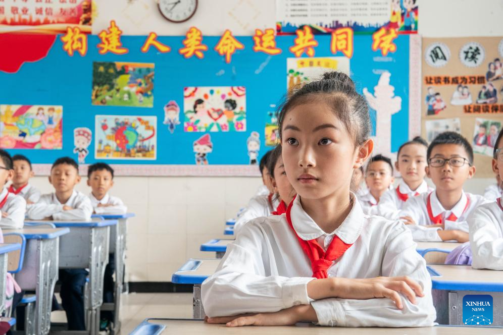 KUNMING, 5 septiembre, 2024 (Xinhua) -- Imagen del 2 de septiembre de 2024 de estudiantes observando saludos de un video pregrabado de estudiantes del Instituto Confucio de la Universidad Nacional de Guinea Ecuatorial en la Escuela Primaria de la Amistad China-Guinea Ecuatorial, en el distrito de Jinping, en la provincia de Yunnan, en el suroeste de China. Un nuevo semestre llegó como estaba previsto, y los alumnos de la Escuela Primaria de la Amistad China-Guinea Ecuatorial se sorprendieron gratamente al recibir mensajes de video de sus homólogos africanos al comienzo del nuevo año escolar el lunes en la provincia de Yunnan, en el suroeste de China. (Xinhua/Hu Chao)