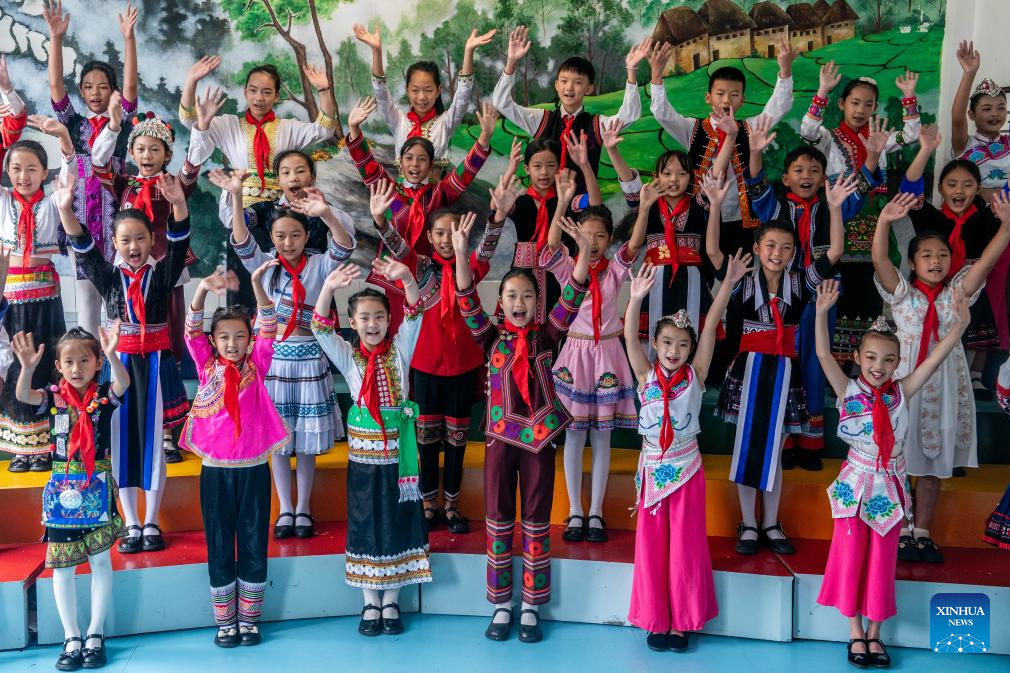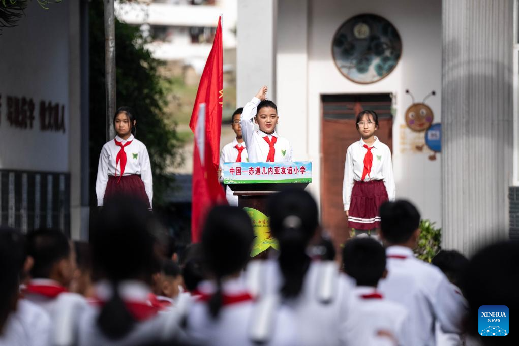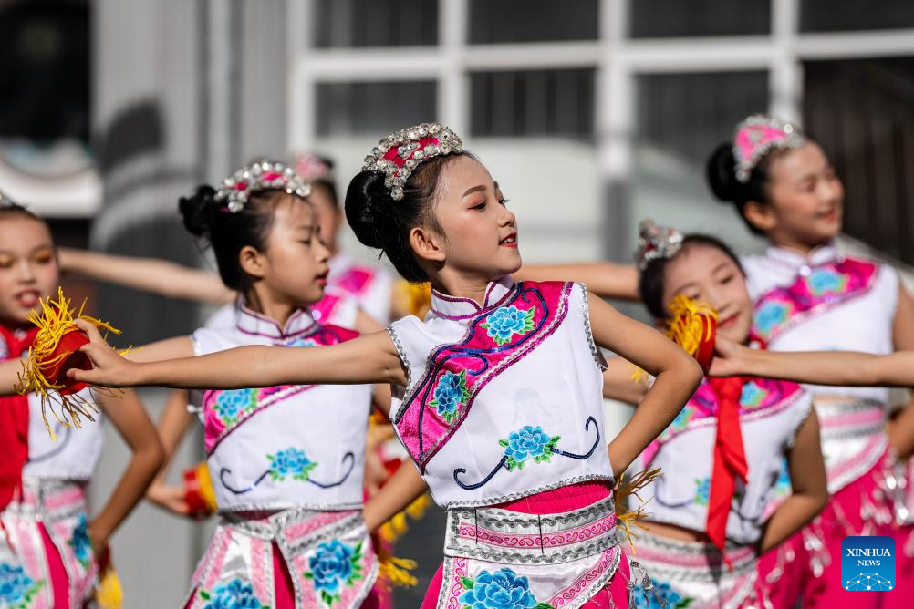 KUNMING, 5 septiembre, 2024 (Xinhua) -- Imagen del 2 de septiembre de 2024 de estudiantes realizando una presentación durante una ceremonia para marcar el comienzo de un nuevo año escolar en la Escuela Primaria de la Amistad China-Guinea Ecuatorial, en el distrito de Jinping, en la provincia de Yunnan, en el suroeste de China. Un nuevo semestre llegó como estaba previsto, y los alumnos de la Escuela Primaria de la Amistad China-Guinea Ecuatorial se sorprendieron gratamente al recibir mensajes de video de sus homólogos africanos al comienzo del nuevo año escolar el lunes en la provincia de Yunnan, en el suroeste de China. (Xinhua/Hu Chao)