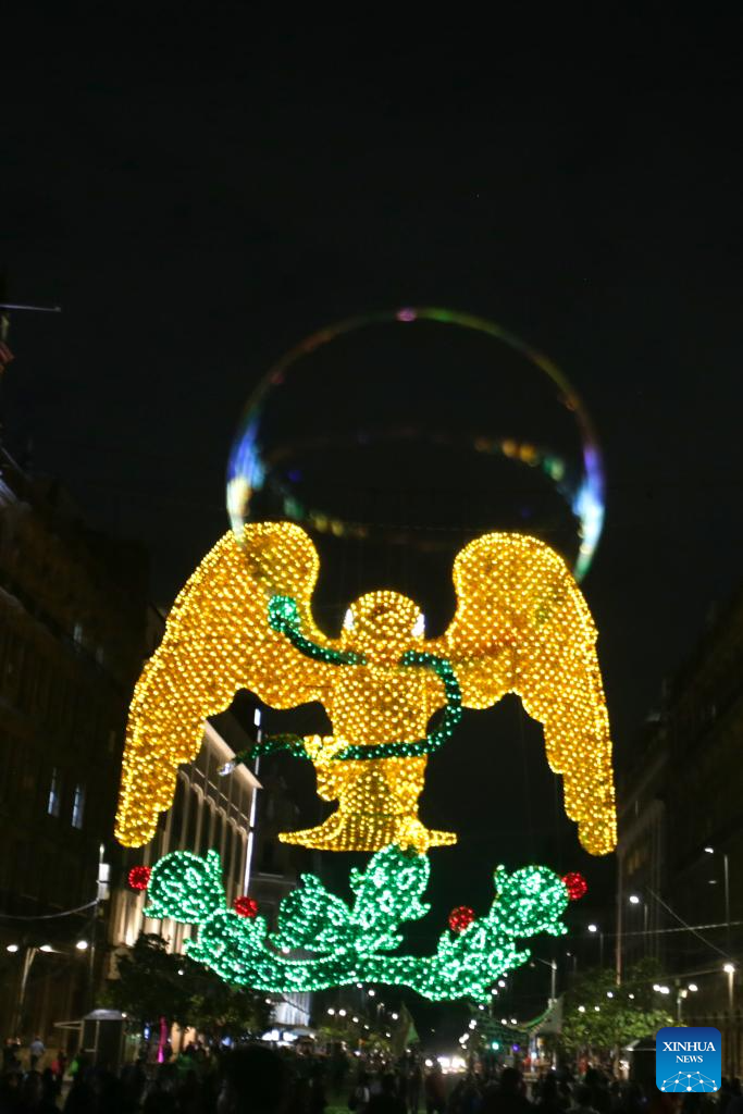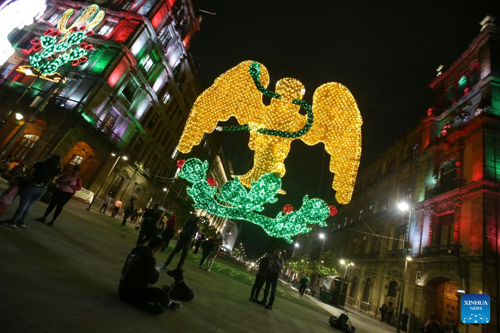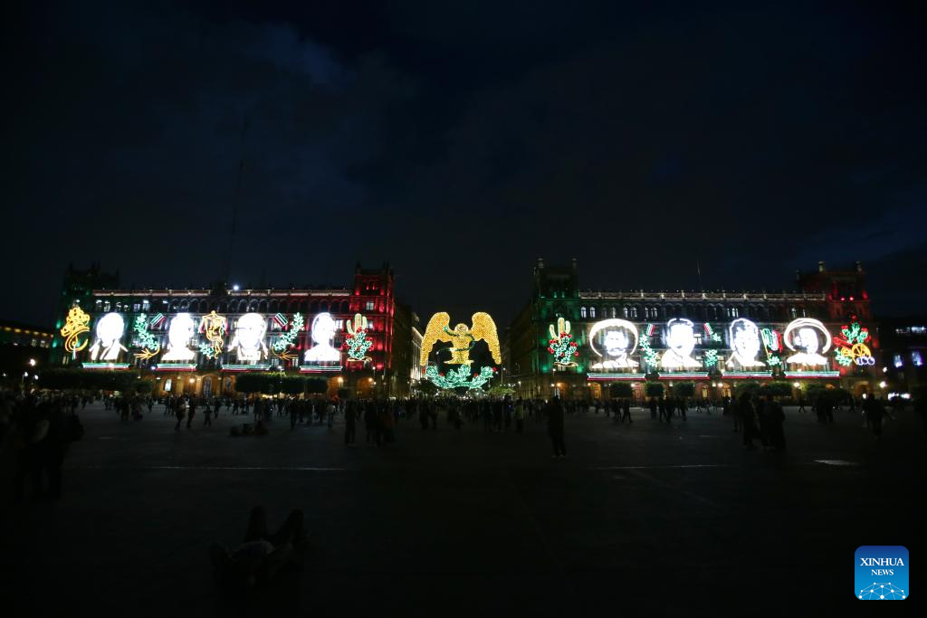 CIUDAD DE MEXICO, 5 septiembre, 2024 (Xinhua) -- Imagen del 4 de septiembre de 2024 del alumbrado decorativo colocado con motivo del 214º Aniversario de la Independencia de México, en el Zócalo de la Ciudad de México, capital de México. (Xinhua/Francisco Cañedo)
