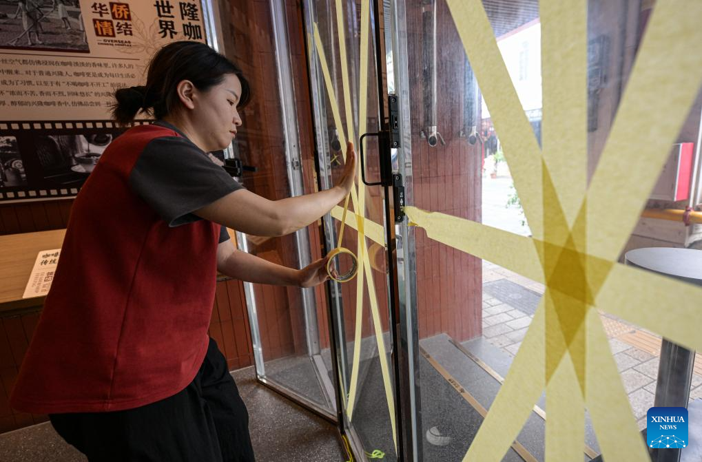 HAIKOU, 5 septiembre, 2024 (Xinhua) -- Una empleada de una cafetería refuerza una ventana de cristal, en Haikou, en la provincia de Hainan, en el sur de China, el 5 de septiembre de 2024. La Oficina Estatal de Control de Inundaciones y Alivio de Sequías elevó su protocolo de respuesta de emergencia para la prevención de inundaciones y tifones del nivel III al II en las provincias de Guangdong y Hainan a las 15:00 horas del jueves, a medida que se acerca el tifón Yagi. Se espera que Yagi toque tierra el viernes por la tarde o por la noche en algún lugar entre la ciudad de Qionghai, en Hainan y la ciudad de Maoming, en Guangdong. (Xinhua/Pu Xiaoxu)
