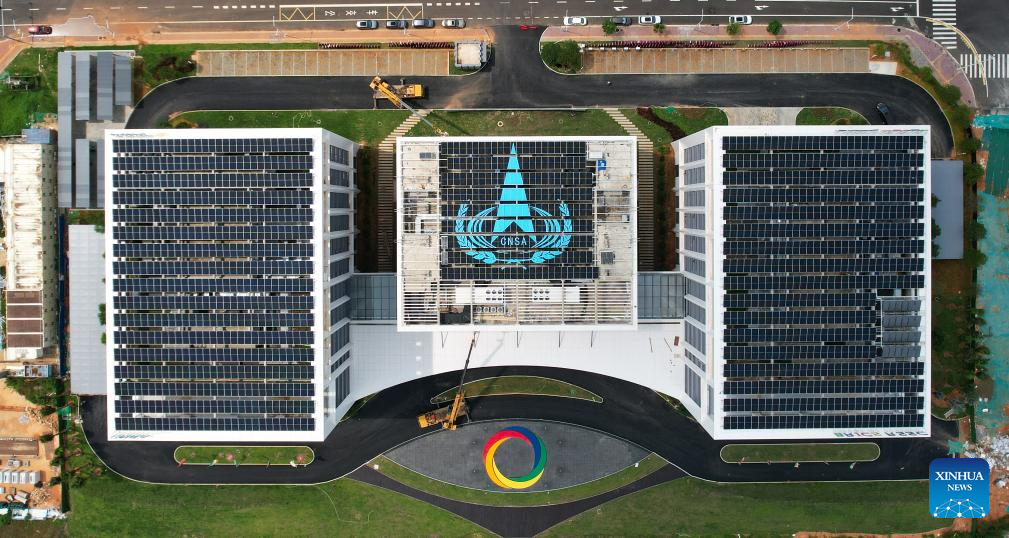 WENCHANG, 5 septiembre, 2024 (Xinhua) -- Imagen aérea tomada con un dron el 4 de septiembre de 2024 de un proyecto de satélite de teledetección, en la Ciudad Aeroespacial Internacional de Wenchang, en la provincia de Hainan, en el sur de China. La provincia insular de Hainan, en el sur de China, elevó hoy jueves su respuesta de emergencia al máximo nivel ante el inminente arribo del tifón Yagi, informó la autoridad local de gestión de emergencias.(Xinhua/Yang Guanyu)