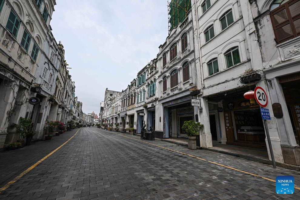 HAIKOU, 5 septiembre, 2024 (Xinhua) -- La antigua calle Qilou es vista, en Haikou, en la provincia de Hainan, en el sur de China, el 5 de septiembre de 2024. La Oficina Estatal de Control de Inundaciones y Alivio de Sequías elevó su protocolo de respuesta de emergencia para la prevención de inundaciones y tifones del nivel III al II en las provincias de Guangdong y Hainan a las 15:00 horas del jueves, a medida que se acerca el tifón Yagi. Se espera que Yagi toque tierra el viernes por la tarde o por la noche en algún lugar entre la ciudad de Qionghai, en Hainan y la ciudad de Maoming, en Guangdong. (Xinhua/Pu Xiaoxu)