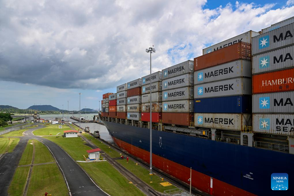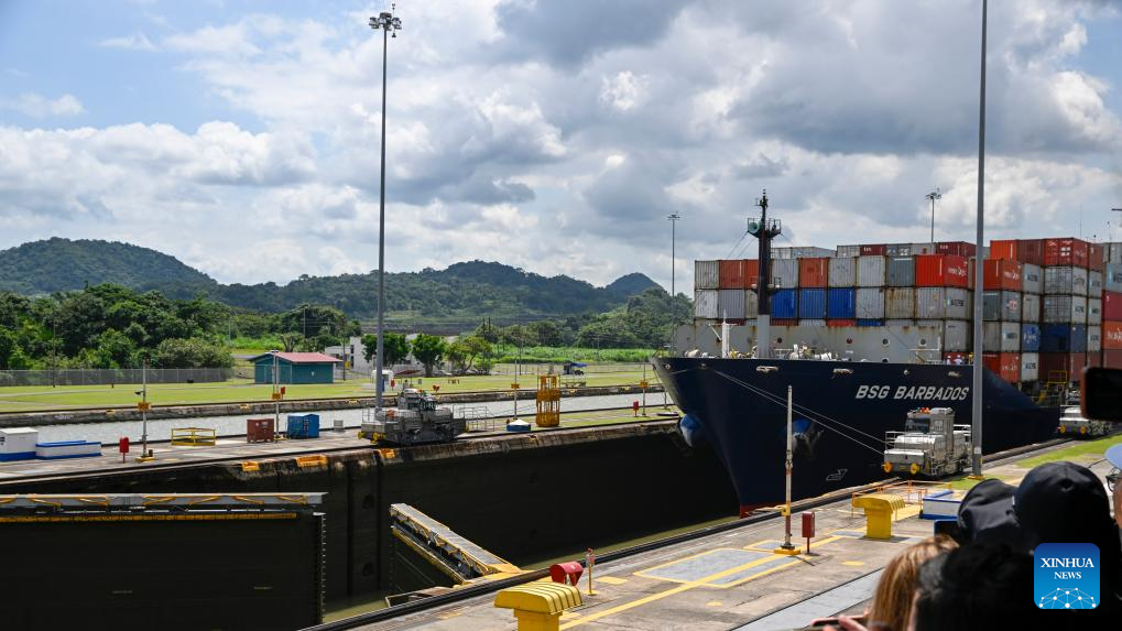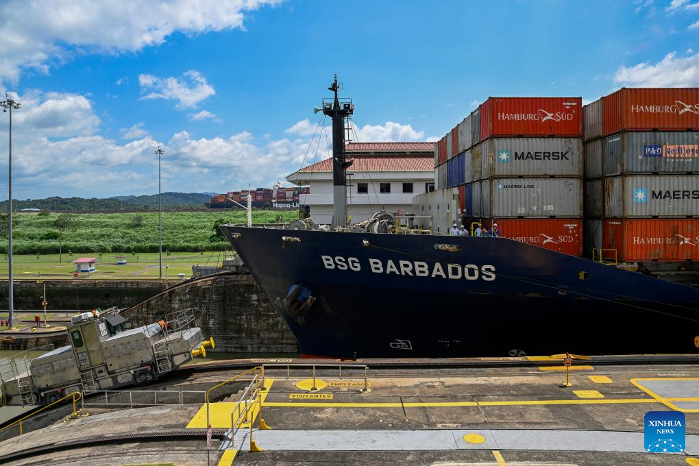PANAMA, 6 septiembre, 2024 (Xinhua) -- Imagen del 28 de agosto de 2024 de un buque de carga navegando a través de las Esclusas de Miraflores en el Canal de Panamá, cerca de la Ciudad de Panamá, Panamá. El Canal de Panamá, que conecta los océanos Pacífico y Atlántico, tiene una extensión de más de 80 kilómetros y es una de las vías fluviales comerciales más importantes del mundo. El Canal de Panamá fue inaugurado oficialmente el 15 de agosto de 1914. Este año se conmemora el 110 aniversario de su inauguración. (Xinhua/Li Muzi)