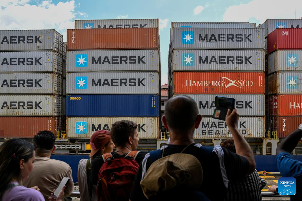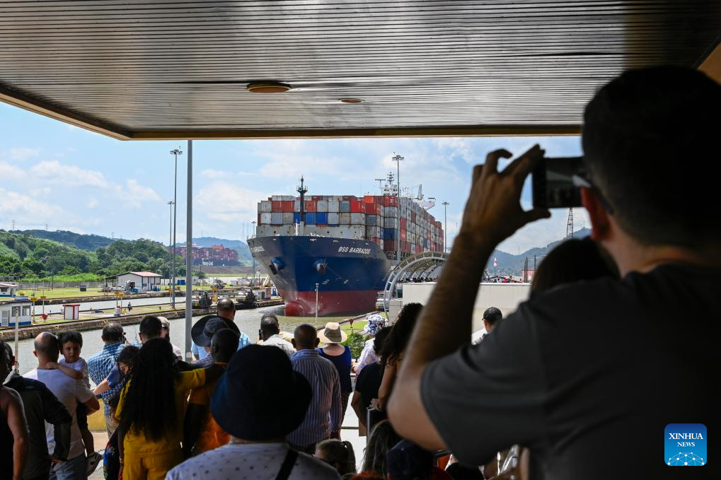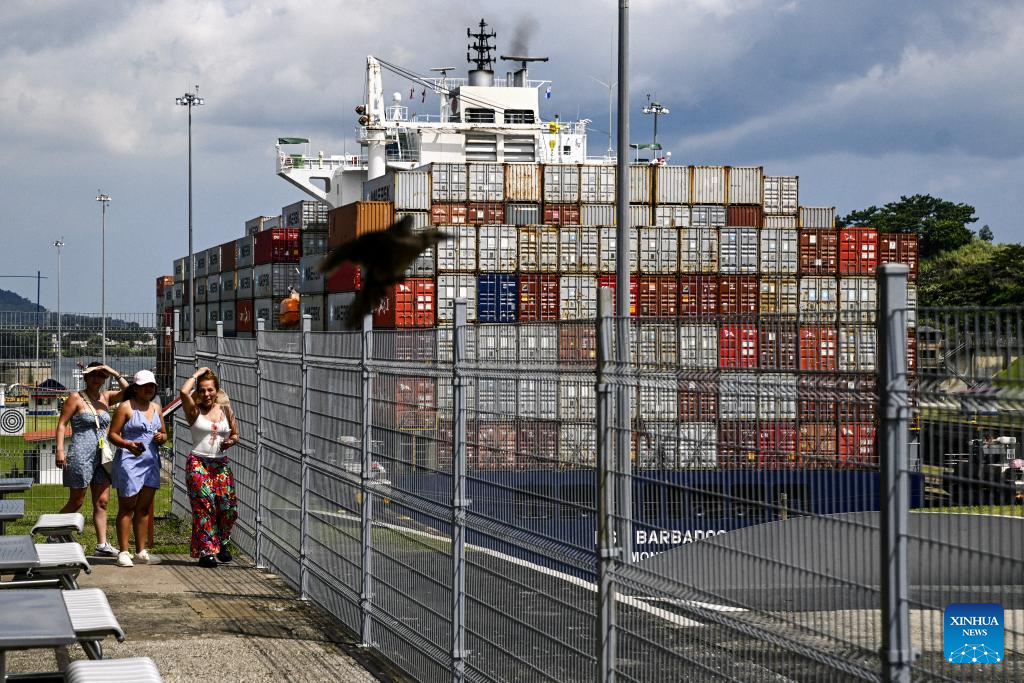 PANAMA, 6 septiembre, 2024 (Xinhua) -- Imagen del 28 de agosto de 2024 de visitantes observando un buque de carga navegando en el Canal de Panamá, cerca de la Ciudad de Panamá, Panamá. El Canal de Panamá, que conecta los océanos Pacífico y Atlántico, tiene una extensión de más de 80 kilómetros y es una de las vías fluviales comerciales más importantes del mundo. El Canal de Panamá fue inaugurado oficialmente el 15 de agosto de 1914. Este año se conmemora el 110 aniversario de su inauguración. (Xinhua/Li Muzi)
