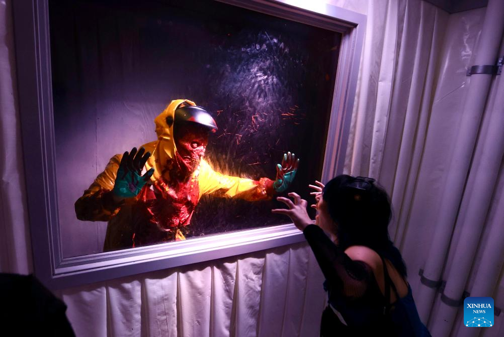 LOS ANGELES, 6 septiembre, 2024 (Xinhua) -- Imagen del 5 de septiembre de 2024 de una visitante reaccionando ante un actor en un laberinto durante la noche de apertura de las Noches de Terror de Halloween 2024 en Universal Studios Hollywood, en Los Angeles, California, Estados Unidos. Universal Studios Hollywood en Los Angeles comenzó el jueves sus Noches de Terror de Halloween, un evento anual temático de Halloween. (Xinhua/Qiu Chen)