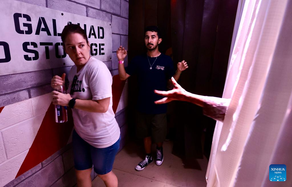 LOS ANGELES, 6 septiembre, 2024 (Xinhua) -- Imagen del 5 de septiembre de 2024 de visitantes reaccionando ante un actor en un laberinto durante la noche de apertura de las Noches de Terror de Halloween 2024 en Universal Studios Hollywood, en Los Angeles, California, Estados Unidos. Universal Studios Hollywood en Los Angeles comenzó el jueves sus Noches de Terror de Halloween, un evento anual temático de Halloween. (Xinhua/Qiu Chen)