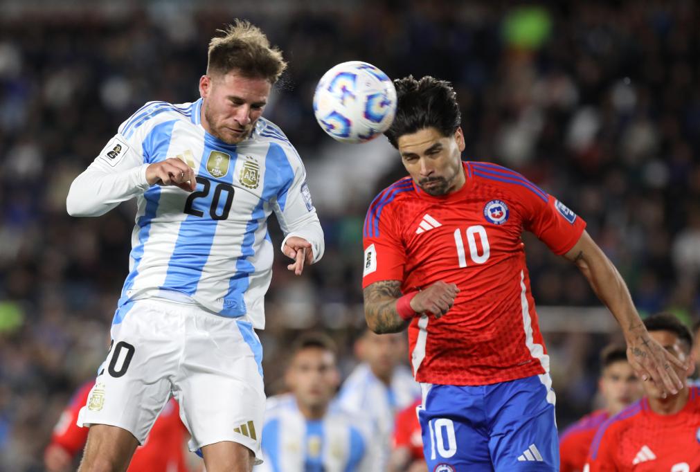 BUENOS AIRES, 6 septiembre, 2023 (Xinhua) -- Imagen del 5 de septiembre de 2024 del jugador Alexis Mac Allister (i), de Argentina, disputando el balón con Víctor Dávila (d), de Chile, durante el partido por las Eliminatorias Sudamericanas para el Mundial de Estados Unidos, México y Canadá 2026 celebrado en el estadio Mas Monumental, en la ciudad de Buenos Aires, Argentina. (Xinhua/Martín Zabala)