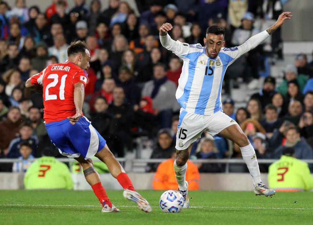 BUENOS AIRES, 6 septiembre, 2023 (Xinhua) -- Imagen del 5 de septiembre de 2024 del jugador Nicolás González (d), de Argentina, disputando el balón con Matías Catalán (i), de Chile, durante el partido por las Eliminatorias Sudamericanas para el Mundial de Estados Unidos, México y Canadá 2026 celebrado en el estadio Mas Monumental, en la ciudad de Buenos Aires, Argentina. (Xinhua/Martín Zabala)