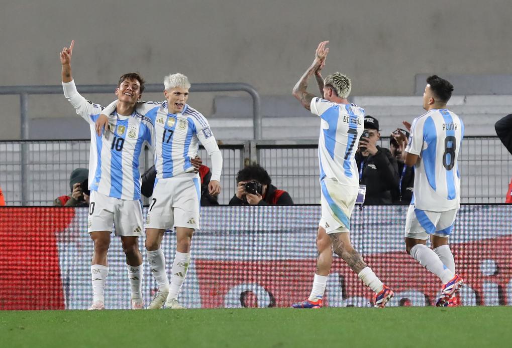 BUENOS AIRES, 6 septiembre, 2023 (Xinhua) -- Imagen del 5 de septiembre de 2024 del jugador Paulo Dybala (d), de Argentina, festejando su anotación junto a sus compañeros de equipo durante el partido por las Eliminatorias Sudamericanas para el Mundial de Estados Unidos, México y Canadá 2026, ante Chile, celebrado en el estadio Mas Monumental, en la ciudad de Buenos Aires, Argentina. (Xinhua/Martín Zabala)