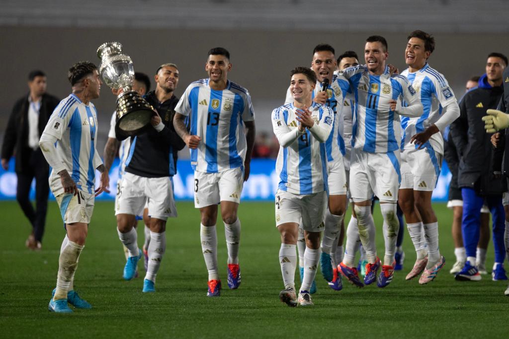 BUENOS AIRES, 6 septiembre, 2023 (Xinhua) -- Imagen del 5 de septiembre de 2024 de jugadores de la selección Argentina reaccionando luego de recibir una réplica de la Copa América al finalizar el partido, por las Eliminatorias Sudamericanas para el Mundial de Estados Unidos, México y Canadá 2026, ante Chile, celebrado en el estadio Mas Monumental, en la ciudad de Buenos Aires, Argentina. (Xinhua/Martín Zabala)