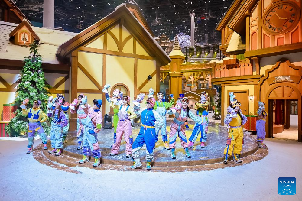 SHANGHAI, 6 septiembre, 2024 (Xinhua) -- Trabajadores realizan una presentación en la Estación Temática de Esquí Cubierta L+SNOW de Shanghai, en Shanghai, en el sur de China, el 6 de septiembre de 2024. El L+SNOW de Shanghai, que alberga la instalación de esquí cubierta más grande del mundo, comenzó a funcionar en Shanghai el viernes. (Xinhua)