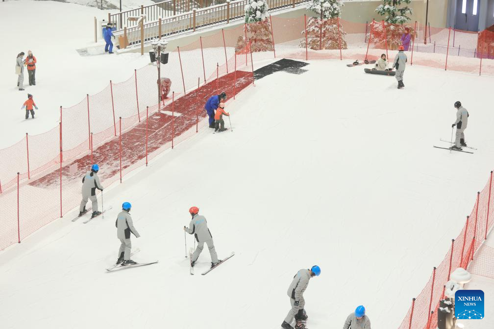 SHANGHAI, 6 septiembre, 2024 (Xinhua) -- Personas esquían en la Estación Temática de Esquí Cubierta L+SNOW de Shanghai, en Shanghai, en el sur de China, el 6 de septiembre de 2024. El L+SNOW de Shanghai, que alberga la instalación de esquí cubierta más grande del mundo, comenzó a funcionar en Shanghai el viernes. (Xinhua)