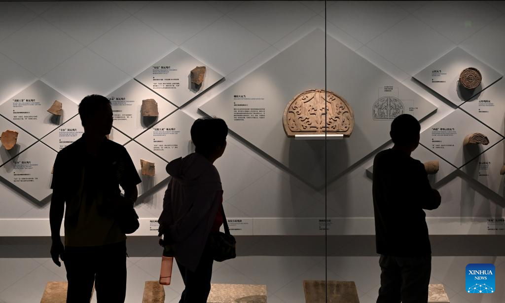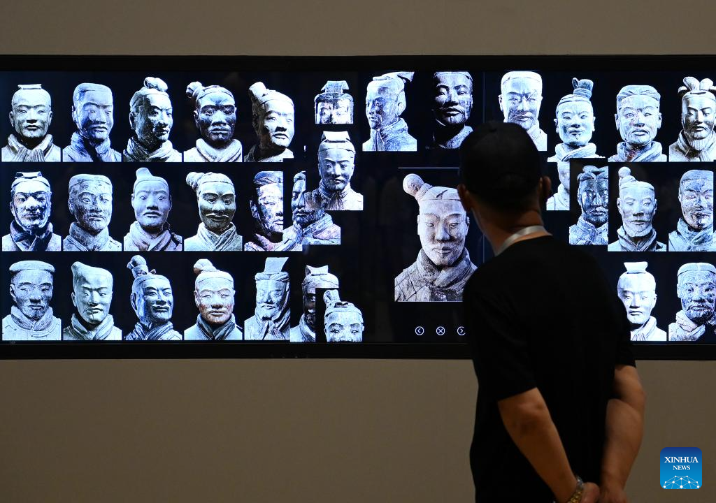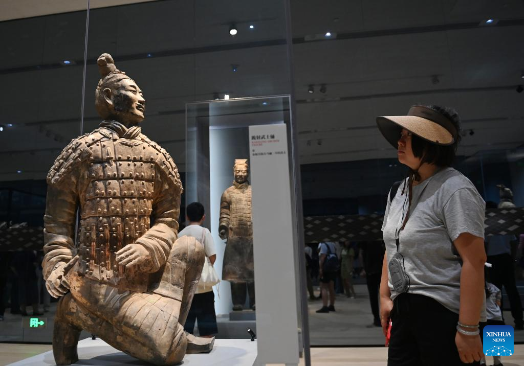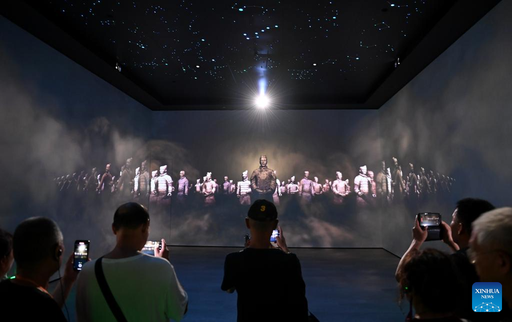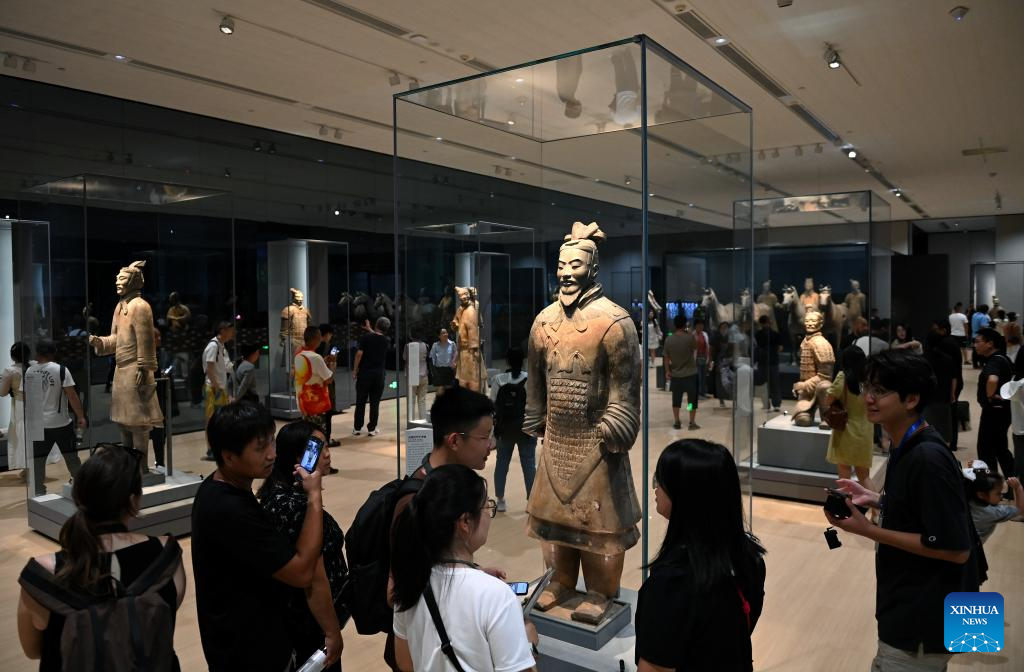 XI'AN, 8 septiembre, 2024 (Xinhua) -- Personas visitan una exposición, conmemorando el 50º aniversario del descubrimiento y la excavación de los icónicos Guerreros de Terracota, en el Museo del Mausoleo del Emperador Qinshihuang, en Xi'an, capital de la provincia de Shaanxi, en el noroeste de China, el 8 de septiembre de 2024. La exhibición que se inauguró el domingo, presenta 230 reliquias culturales en ocho categorías, muchas de las cuales se revelan al público por primera vez, ofreciendo una visión de la era del emperador Qinshihuang de la dinastía Qin (221 - 207 a. C.). (Xinhua/Li Yibo)