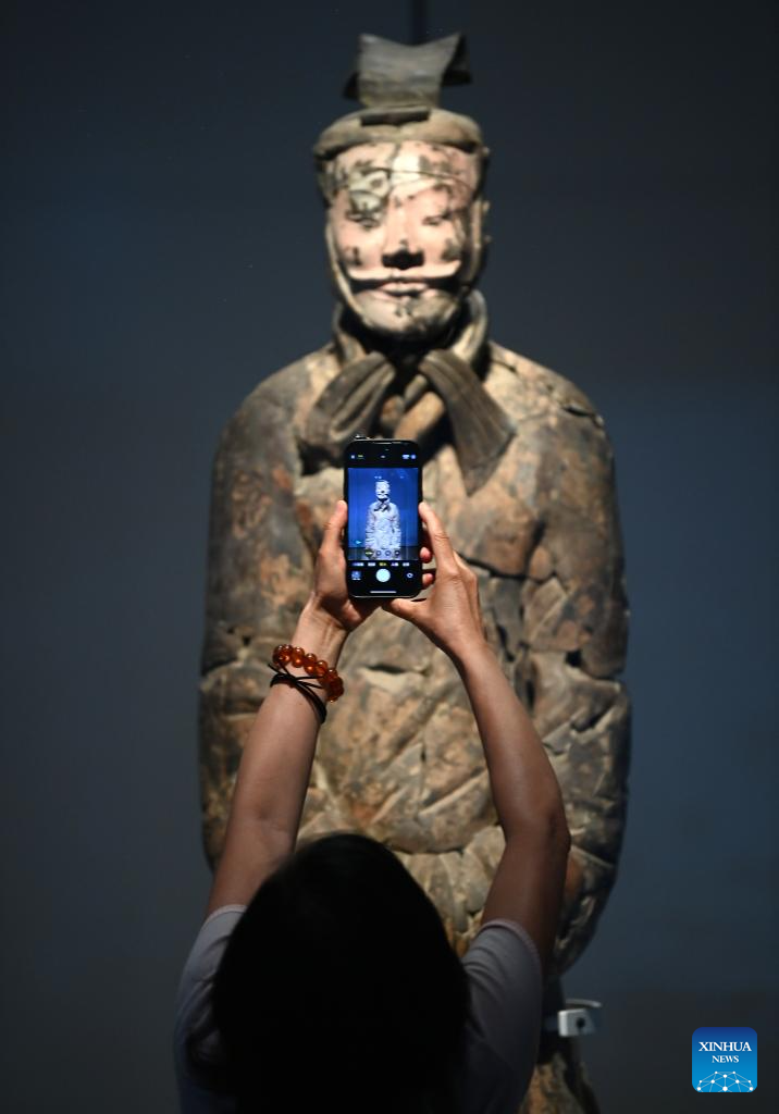 XI'AN, 8 septiembre, 2024 (Xinhua) -- Una visitante toma fotografías en una exposición, conmemorando el 50º aniversario del descubrimiento y la excavación de los icónicos Guerreros de Terracota, en el Museo del Mausoleo del Emperador Qinshihuang, en Xi'an, capital de la provincia de Shaanxi, en el noroeste de China, el 8 de septiembre de 2024. La exhibición que se inauguró el domingo, presenta 230 reliquias culturales en ocho categorías, muchas de las cuales se revelan al público por primera vez, ofreciendo una visión de la era del emperador Qinshihuang de la dinastía Qin (221 - 207 a. C.). (Xinhua/Li Yibo)