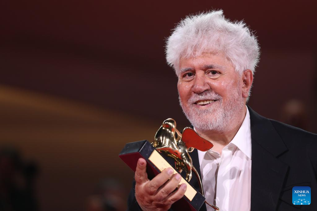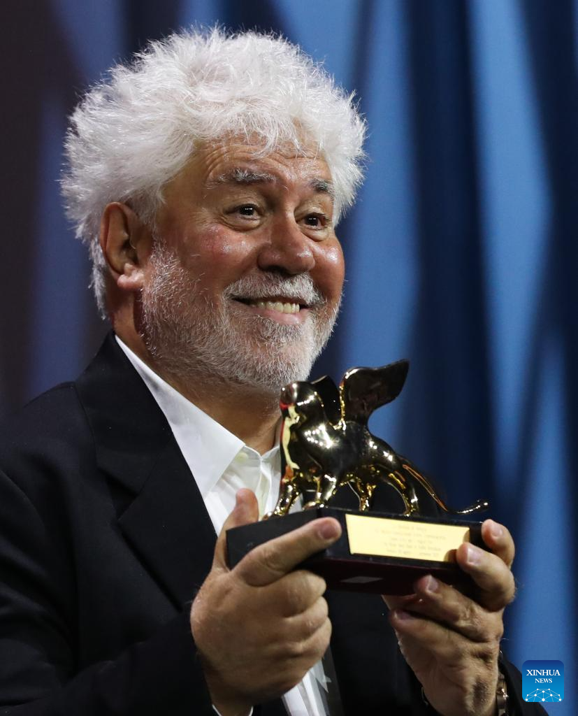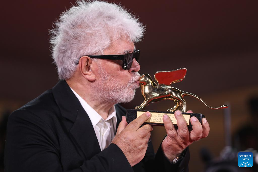 VENECIA, 8 septiembre, 2024 (Xinhua) -- Imagen del 7 de septiembre de 2024 del director español Pedro Almodóvar posando con el premio León de Oro para Mejor Película por "The Room Next Door" en la ceremonia de premiación del 81° Festival de Cine de Venecia, en Venecia, Italia. El 81° Festival de Cine de Venecia se clausuró aquí el sábado. (Xinhua/Li Jing)